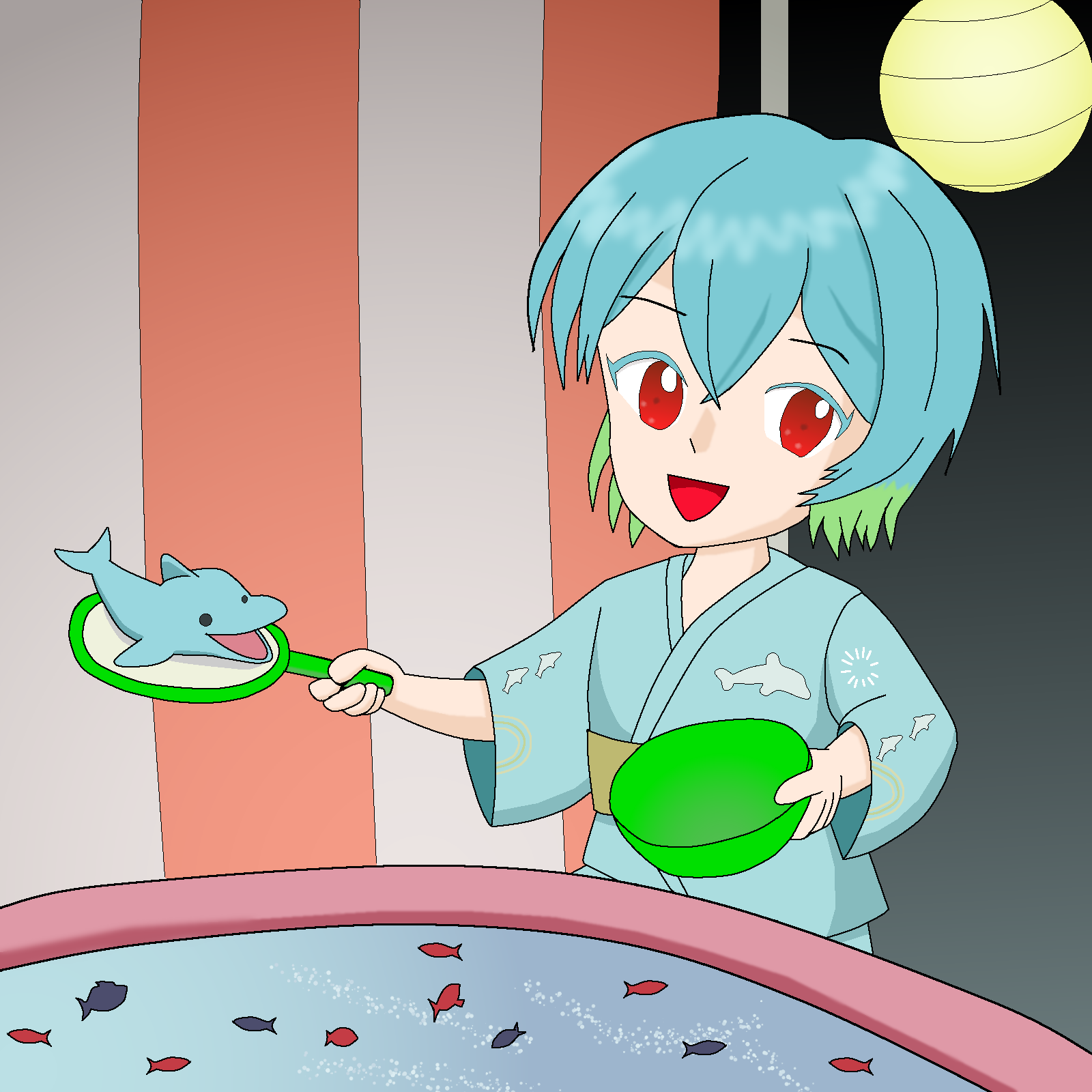 左手に持っているのは果物のキウイで、鳥のキウイもイルカに乗っています。