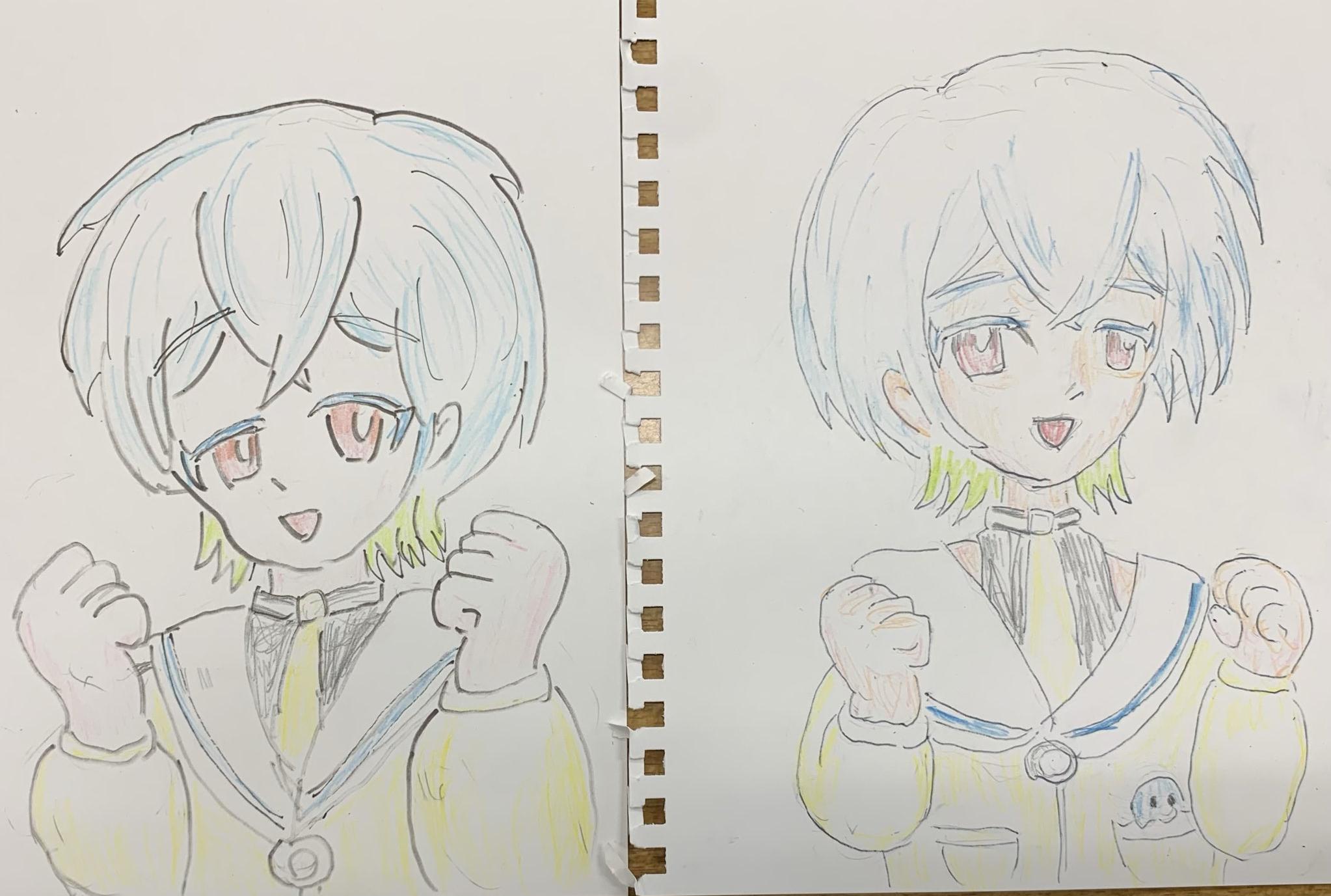 アナログ絵は修正が難しいので苦手です。特に左の絵は目の位置が低すぎ。