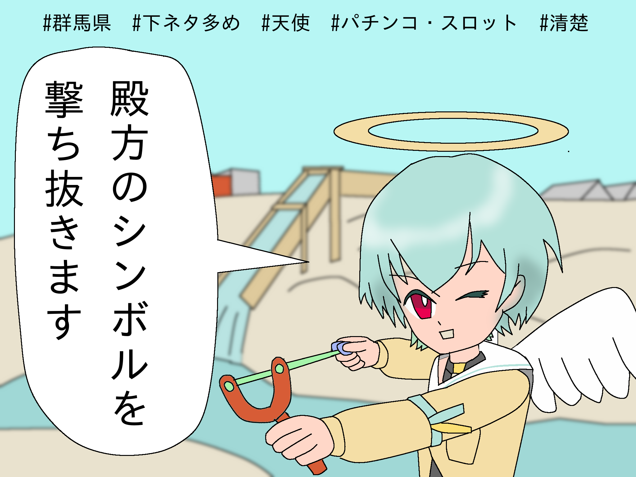 湯畑(草津温泉)でパチンコ(投石器)を構える天使イルカ。