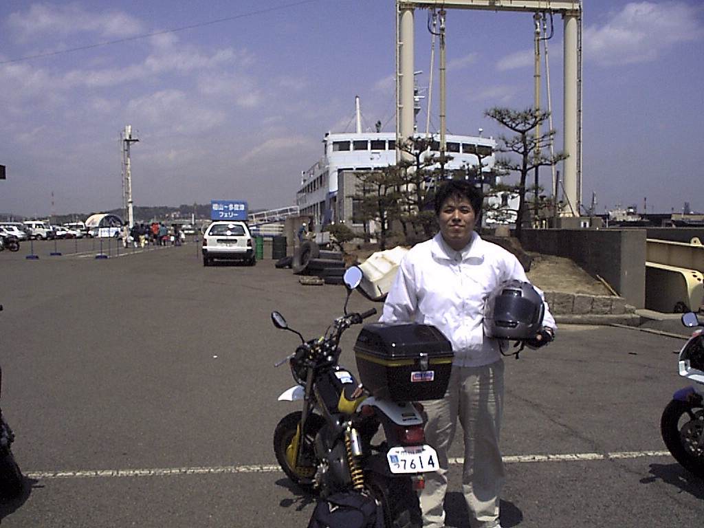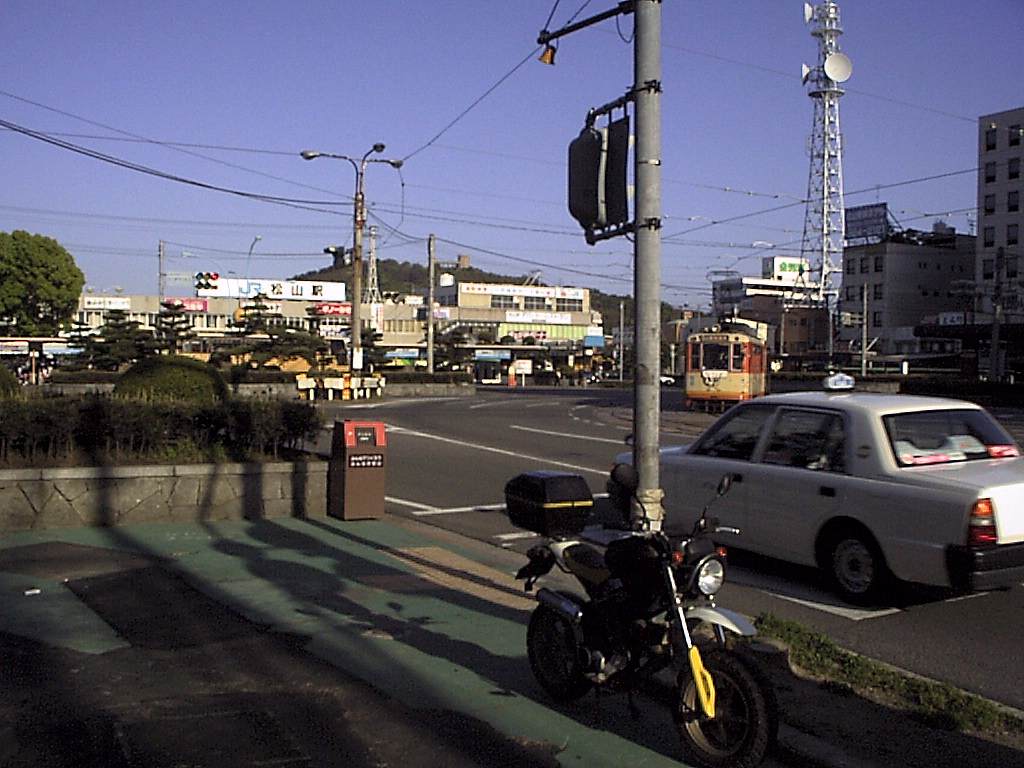 2000年5月3日(水)。ホテルを出た後、復活したバイク・ストリートマジック2を少し走らせて松山駅前で記念撮影しました。