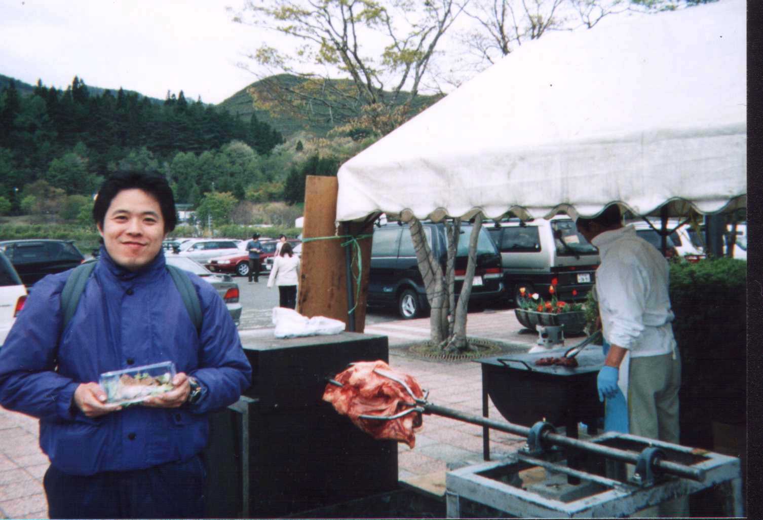 看板には岩手牛の丸焼き…とありました。串に刺さった牛肉が炭火の上で回ってます。